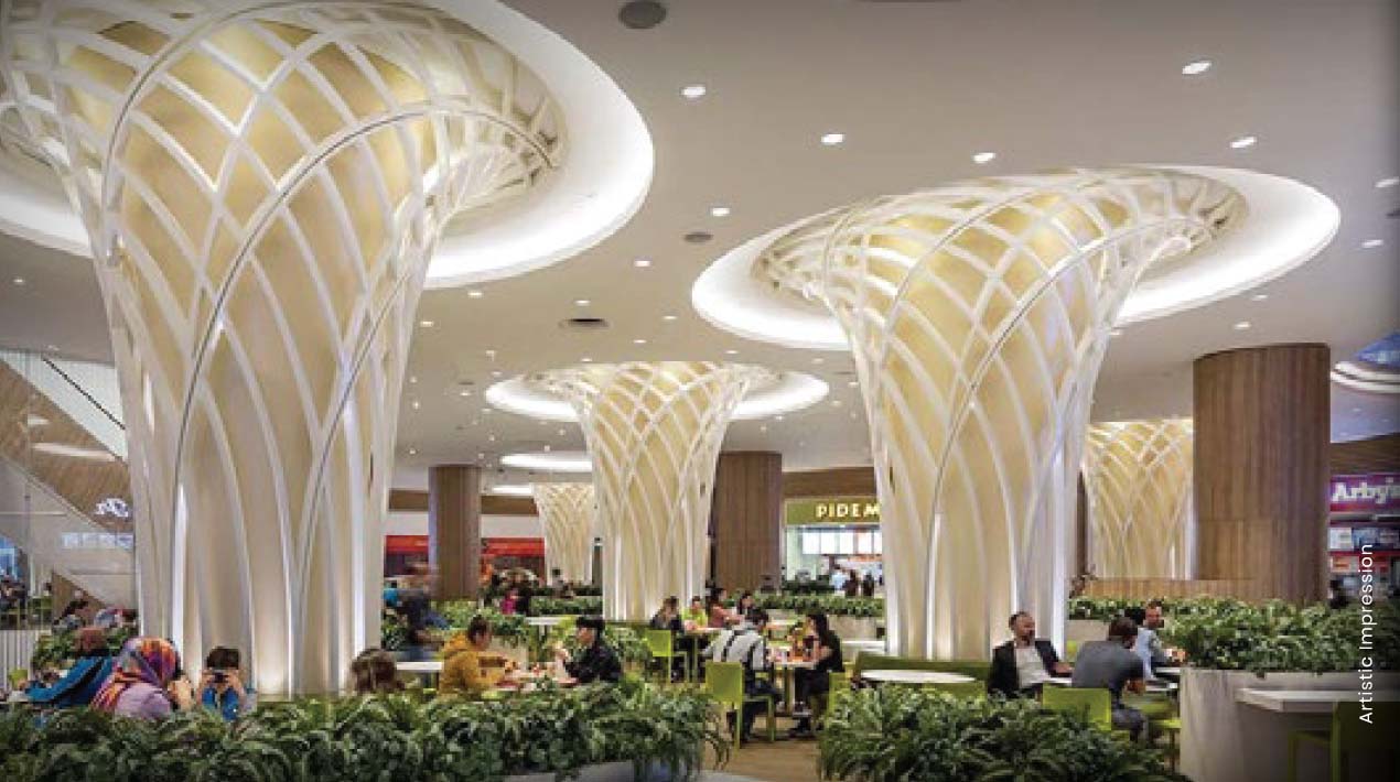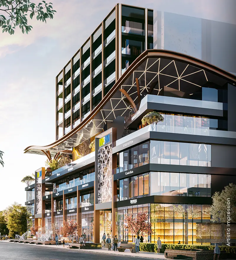 The project features high-street retail, premium office spaces, food courts, cafés, and double-height showrooms for flagship brands.