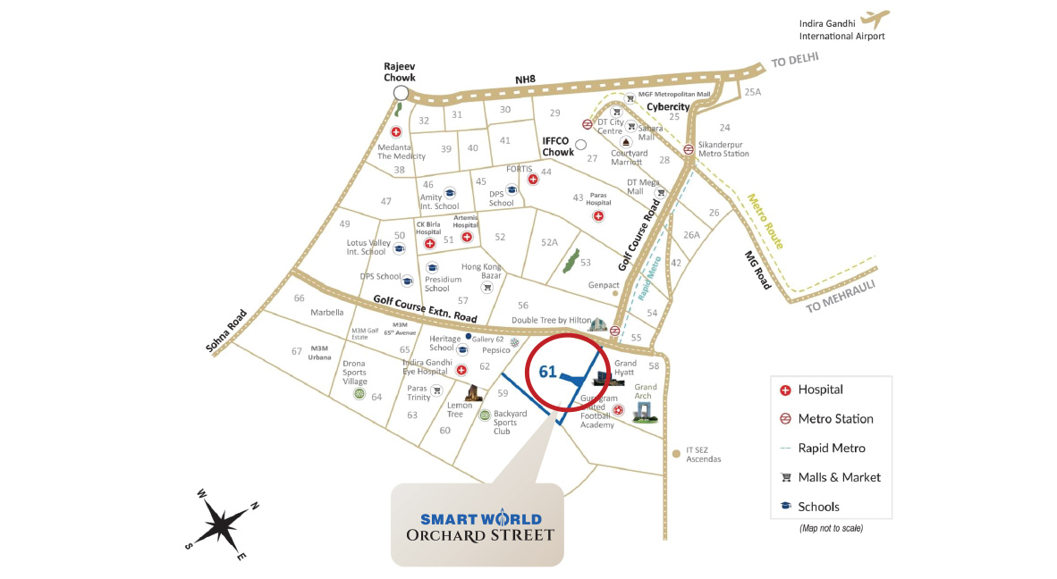 Situated in Sector 61 on Golf Course Extension Road, Smartworld Orchard Street Location Map ensures seamless connectivity and high visibility.